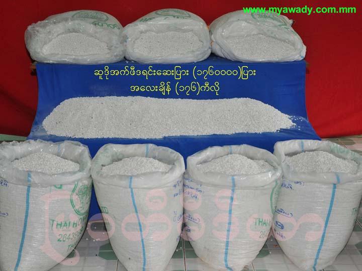 မူးယစ္ေဆးမ်ား စစ္ေဆးရာတြင္ ယာဥ္ေမာင္း ခ်စ္ကုိဦး ယူေဆာင္လာေသာ အိတ္(၈) လုံးအား စစ္ေဆးရာ ဆူဒုိအက္ဖီဒရင္းဟု ယူဆရေသာ ေဆးျပားမ်ားကုိ အိတ္(၁)လုံးလွ်င္ ၂ သိန္း ၂ ေသာင္းႏႈန္းျဖင့္ စုစုေပါင္း မူးယစ္ေဆးျပားေပါင္း တစ္ဆယ့္ခုနစ္သိန္း ေျခာက္ေသာင္း (၁၇၆၀၀၀၀) သိမ္းဆည္း ရမိၿပီး ကာလေပါက္ေစ်း ေငြက်ပ္ သိန္းေပါင္း ၃၅၂၀ ခန္႔ရွိေၾကာင္း သိရွိရပါသည္။